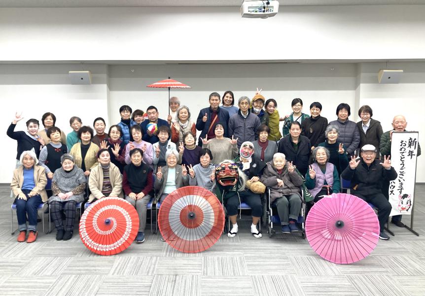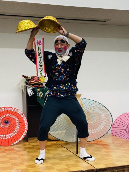 今年の「ももハウス」は、きらめきプラザ(北区南方)からスタート! 3年ぶりに「戦国どじょうすくい・中本さん」をお迎えして「安来節」(=どじょうすくい)を披露し、「どじょうすくい体操」を教えていただきました。そしてお見事な「傘回し」を拝見! 「獅子舞」で、みなさんの頭や肩をかじられて「福」を付けてもらいました!! 今年もたくさんの「福」が来ることを祈念して、みなさんで記念撮影を撮りました !^^)!