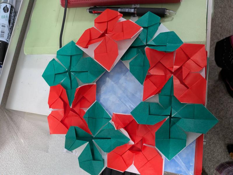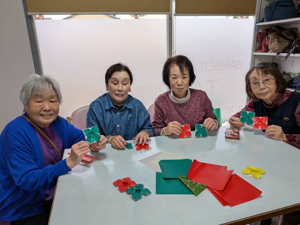 12月12日(火)午前。今年最後の書道教室。とても人気で自分の筆を用意して参加。長半紙にお正月用の文字を書きました!